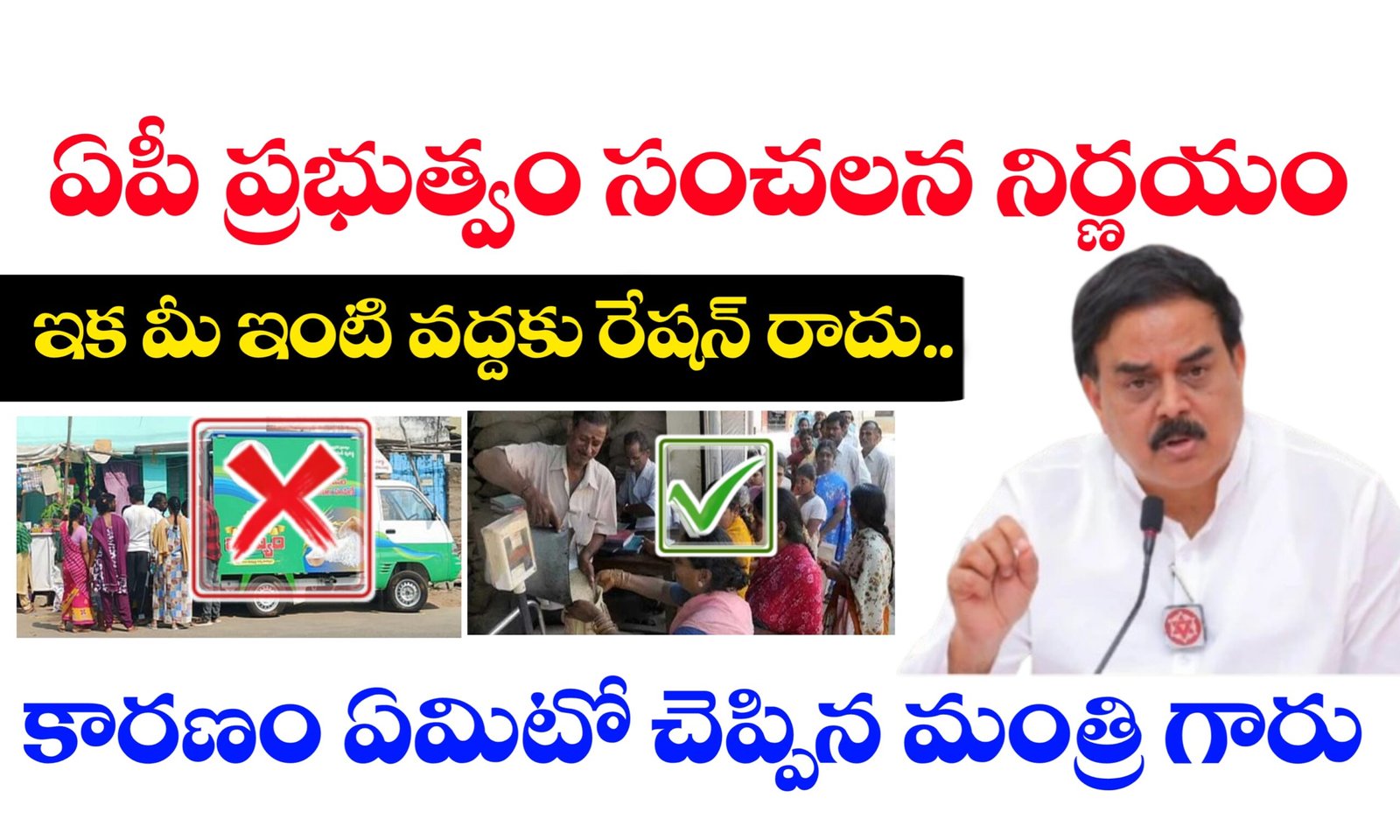 ఆంధ్రప్రదేశ్ ప్రభుత్వం పౌర సరఫరాలకు సంబంధించి ప్రజా పంపిణీ వ్యవస్థలో కీలక మార్పులు తీసుకువచ్చింది. రాష్ట్రంలో ప్రజా పంపిణీ వ్యవస్థలో జరుగుతున్న అవకతవకలను నివారించేందుకు ప్రభుత్వం కట్టుబడి ఉందని తెలియజేస్తూ, ఇందులో భాగంగా ప్రస్తుతం ఉన్న రేషన్ వ్యాన్లు ద్వారా రేషన్ పంపిణీ జరగబోదు అని మంత్రి నాదెండ్ల మనోహర్ గారు తెలియజేశారు.