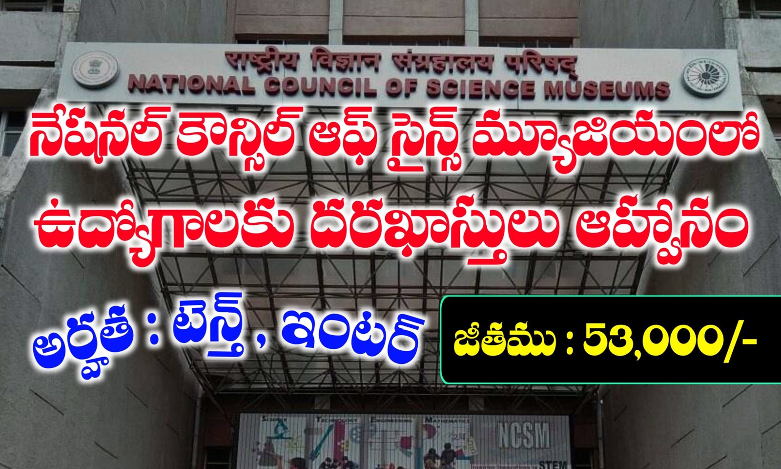 భారత ప్రభుత్వం , మినిస్ట్రీ ఆఫ్ కల్చర్ పరిధిలోని అటానమస్ సైంటిఫిక్ సంస్థ నేషనల్ కౌన్సిల్ ఆఫ్ సైన్స్ మ్యూజియం (NCSM) నుండి వివిధ ఉద్యోగాల భర్తీ నిమిత్తం నోటిఫికేషన్ విడుదల అయ్యింది.