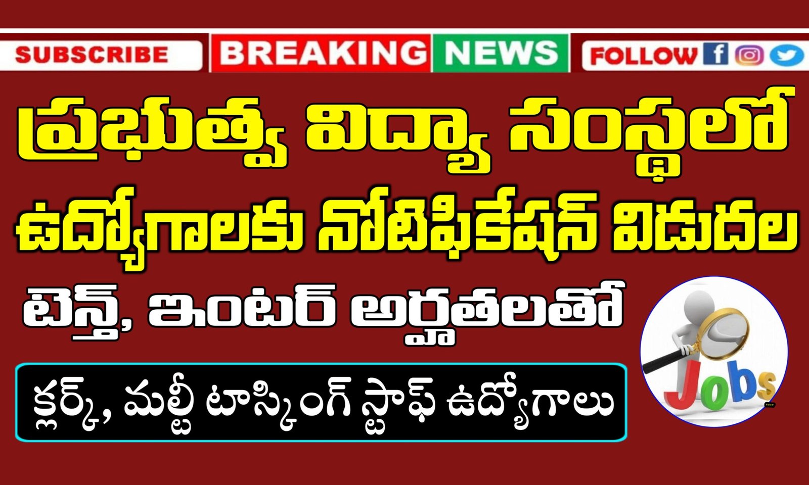 - క్లర్క్ కం టైపిస్ట్ మరియు మల్టీ టాస్కింగ్ స్టాఫ్ (ల్యాబ్ అటెండెంట్ – కంప్యూటర్) అనే ఉద్యోగాలను భర్తీ చేసేందుకు అర్హత ఉన్న నిరుద్యోగుల నుంచి దరఖాస్తులు కోరుతున్నారు.