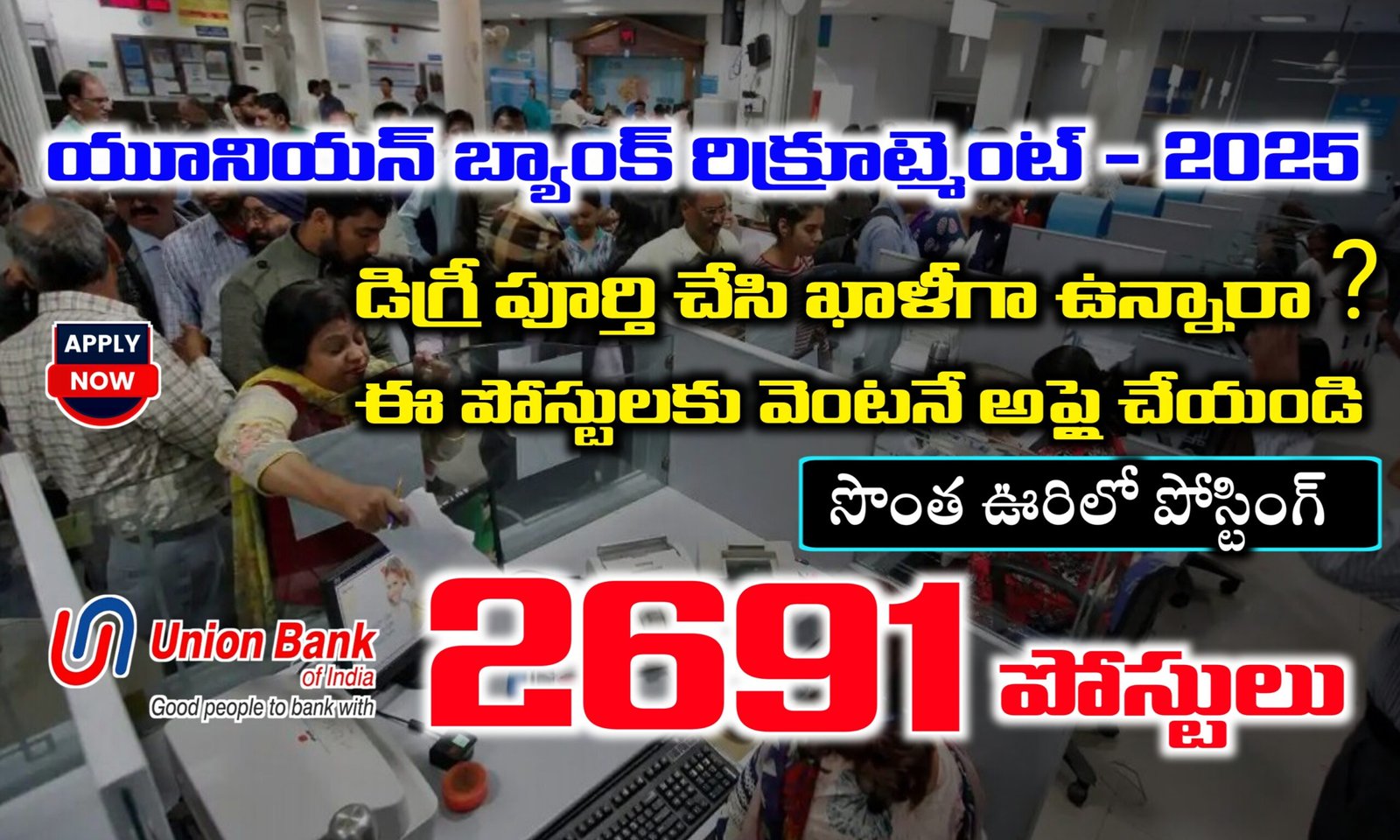 యూనియన్ బ్యాంక్ ఆఫ్ ఇండియా నుండి 2,691 అప్రెంటిస్ పోస్టులు భర్తీ చేసేందుకు అర్హత ఉన్న అభ్యర్థులు నుండి దరఖాస్తులు కోరుతూ నోటిఫికేషన్ విడుదలైంది. అర్హత మరియు ఆసక్తి ఉన్న అభ్యర్థులు ఫిబ్రవరి 19వ తేది నుండి మార్చి 11వ తేది లోపు ఆన్లైన్ విధానంలో అప్లై చేయాలి.