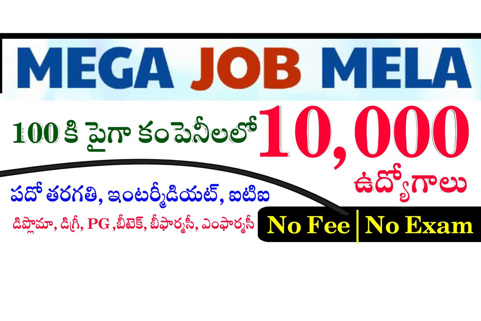 నిరుద్యోగులకు ఉద్యోగ అవకాశాలు కల్పించేందుకు మెగా జాబ్ మేళా నిర్వహిస్తున్నారు. ఈ జాబ్ మేళా ద్వారా పదివేల మందికి ఉద్యోగ అవకాశాలు ఇస్తారు. పదో తరగతి, ఇంటర్మీడియట్, ఐటిఐ, డిప్లొమా, డిగ్రీ, PG ,బీటెక్, బీఫార్మసీ, ఎంఫార్మసీ వంటి వివిధ అర్హతలు కలిగిన వారు ఈ జాబ్ మేళాలో పాల్గొనవచ్చు. 2016 నుండి 2024 మధ్య ఈ కోర్సులు పూర్తి చేసిన వారు ఈ జాబ్ మేళాకు అర్హులు. మహిళా అభ్యర్థులు మరియు పురుష అభ్యర్థులు అందరూ ఈ జాబ్ మేళాలో పాల్గొనవచ్చు.