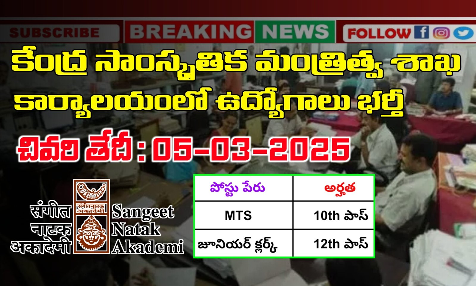 కేంద్ర ప్రభుత్వ సాంస్కృతిక మంత్రిత్వ శాఖకు చెందిన సంగీత్ నాటక్ అకాడమీ నుండి డిప్యూటీ సెక్రటరీ (డాక్యుమెంటేషన్) , స్టెనోగ్రాఫర్, రికార్డింగ్ ఇంజనీర్, అసిస్టెంట్, జూనియర్ క్లర్క్, MTS, అనే ఉద్యోగాలను భర్తీ చేసేందుకు అర్హత ఉన్న వారి నుండి దరఖాస్తులు కోరుతున్నాడు. ఈ ఉద్యోగాలకు అర్హత ఉండేవారు ఫిబ్రవరి 4వ తేదీ నుంచి మార్చి 5వ తేదీ లోపు ఆన్లైన్ విధానంలో అప్లై చేయాల్సి ఉంటుంది.