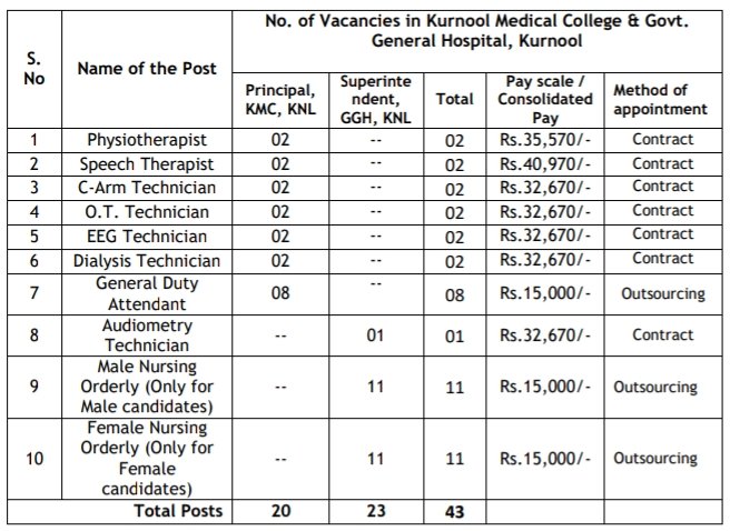 భర్తీ చేస్తున్న ఉద్యోగాలలో కర్నూలు మెడికల్ కాలేజీలో 20 పోస్టులు , కర్నూలు గవర్నమెంట్ హాస్పిటల్లో 23 పోస్టులు భర్తీ చేస్తున్నారు.