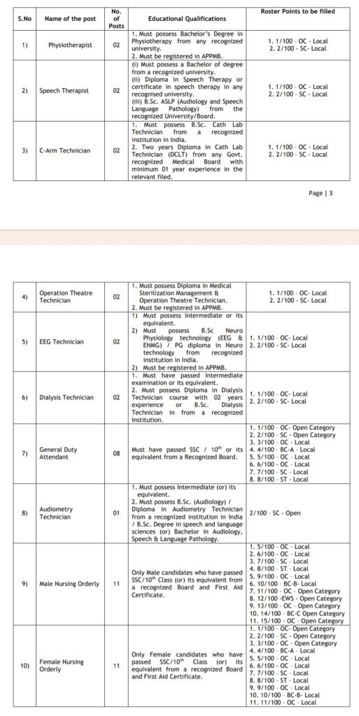 ఈ నోటిఫికేషన్ ద్వారా ఫిజియోథెరపిస్ట్, C-Arm టెక్నీషియన్, స్పీచ్ తెరపిస్ట్, O.T టెక్నీషియన్, EEG టెక్నీషియన్, డయాలసిస్ టెక్నీషియన్, జనరల్ డ్యూటీ అటెండెంట్, ఆడియో మెట్రి టెక్నీషియన్, MNO, FNO అనే ఉద్యోగాలను భర్తీ చేస్తున్నారు. అన్ని రకాల ఉద్యోగాలు కలిపి మొత్తం 43 పోస్టులు భర్తీ చేస్తున్నారు.