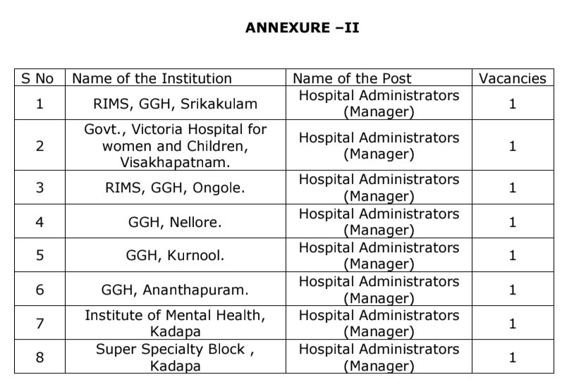 తాజాగా ఆంధ్రప్రదేశ్ మెడికల్ సర్వీసెస్ రిక్రూట్మెంట్ బోర్డ్ విడుదల చేసిన ఈ నోటిఫికేషన్ ద్వారా డైరెక్టర్ ఆఫ్ మెడికల్ ఎడ్యుకేషన్ లో హాస్పిటల్ అడ్మినిస్ట్రేటర్ (మేనేజర్స్) అనే ఉద్యోగాలు భర్తీ చేస్తున్నారు.