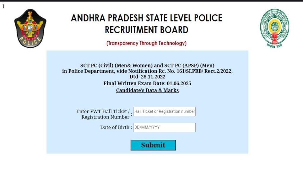 పరీక్ష రాసిన అభ్యర్థులు APSLPRB వెబ్సైట్ లో తుది రాత హాల్ టికెట్ నెంబర్ లేదా రిజిస్ట్రేషన్ నెంబర్ మరియు డేట్ అఫ్ బర్త్ వివరాలతో తమ మార్కులు తెలుసుకోవచ్చు.