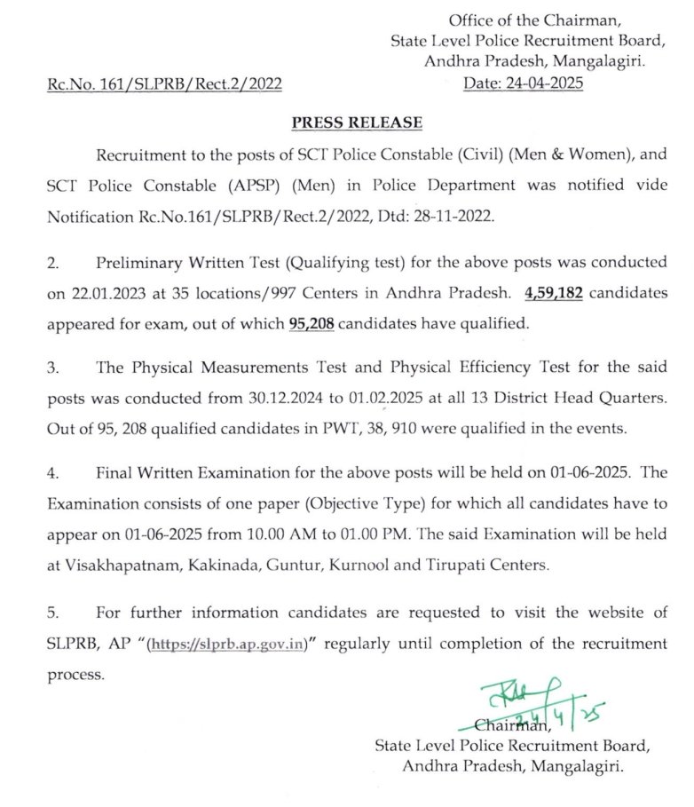 రాష్ట్రంలో 6,100 పోలీస్ కానిస్టేబుల్ పోస్టులకు గాను మెయిన్స్ పరీక్షను 01-06-2025 తేదీన నిర్వహించబోతున్నట్టు పత్రికా ప్రకటన విడుదల చేసింది.