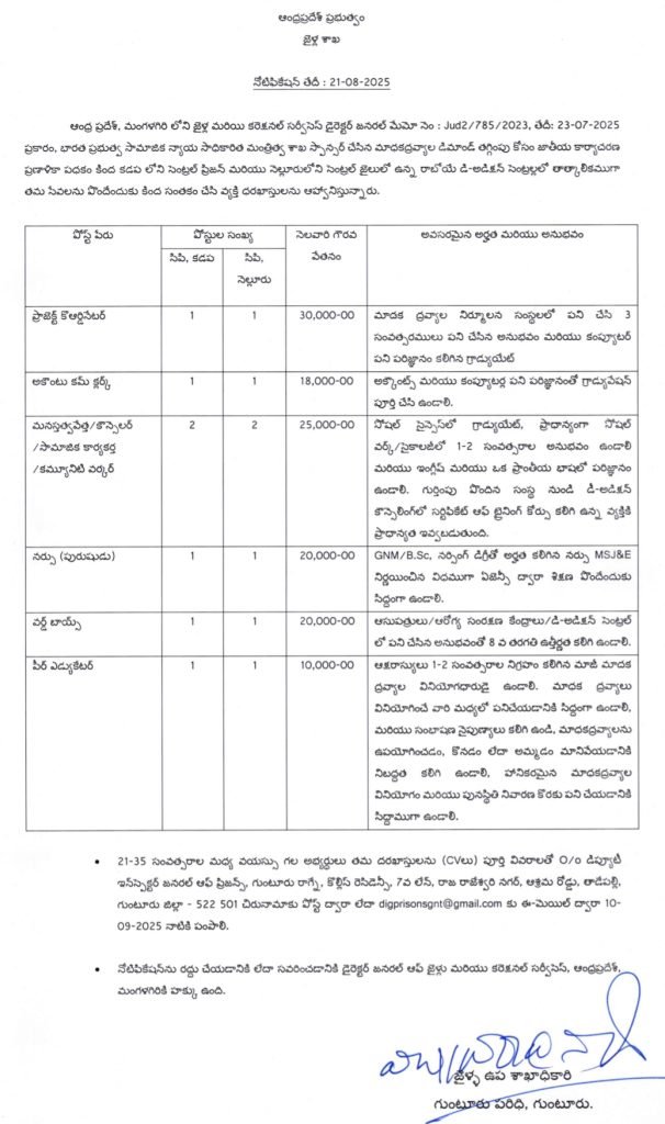 AP Prisons Department Recruitment 2025 : ఆంధ్రప్రదేశ్ ప్రభుత్వం , జైళ్ల శాఖ నుండి కడప మరియు నెల్లూరు సెంట్రల్ ప్రిజన్స్ లో ఏర్పాటు చేయబోయే డ్రగ్ డీ అడిక్షన్ సెంటర్లలలో తాత్కాలికంగా పనిచేసేందుకు అర్హత ఉన్న వారి నుండి దరఖాస్తులు కోరుతూ నోటిఫికేషన్ విడుదలైంది. ఈ నోటిఫికేషన్ ద్వారా భర్తీ చేస్తున్న ఉద్యోగాలకు అర్హత ఉండే వారు తమ దరఖాస్తులను పోస్ట్ ద్వారా లేదా ఈమెయిల్ ద్వారా పంపవచ్చు.