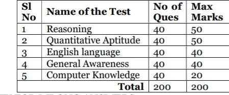 - ఈ పరీక్షలో రీజనింగ్ , క్వాంటిటేటివ్ ఆప్టిట్యూడ్ , ఇంగ్లీష్ లాంగ్వేజ్ , జనరల్ ఎవేర్నెస్ , కంప్యూటర్ నాలెడ్జ్ నుండి ప్రశ్నలు వస్తాయి.