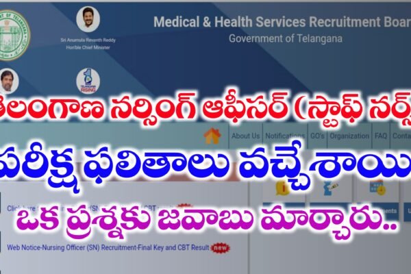 తెలంగాణ రాష్ట్రంలో నర్సింగ్ అభ్యర్థులు గత కొన్ని నెలలుగా ఎదురుచూస్తున్న నర్సింగ్ ఆఫీసర్ పరీక్ష ఫలితాలను మెడికల్ అండ్ హెల్త్ సర్వీసెస్ రిక్రూట్మెంట్ బోర్డు ఈరోజు అధికారికంగా విడుదల చేయడం జరిగింది. అభ్యర్థులు తమ హాల్ టికెట్ నెంబర్, మొబైల్ నెంబర్ మరియు పుట్టిన తేదీ వివరాలు నమోదు చేసి తమ మార్కులు తెలుసుకోవచ్చు. ప్రస్తుతం నార్మలైజేషన్ చేసిన తర్వాత అభ్యర్థులు మార్కులను ప్రకటించడం జరిగింది. ఆరు డెసిమల్ నెంబర్స్ వరకు నార్మలైజేషన్ మార్కులు ఉంటాయి.. తెలంగాణ…