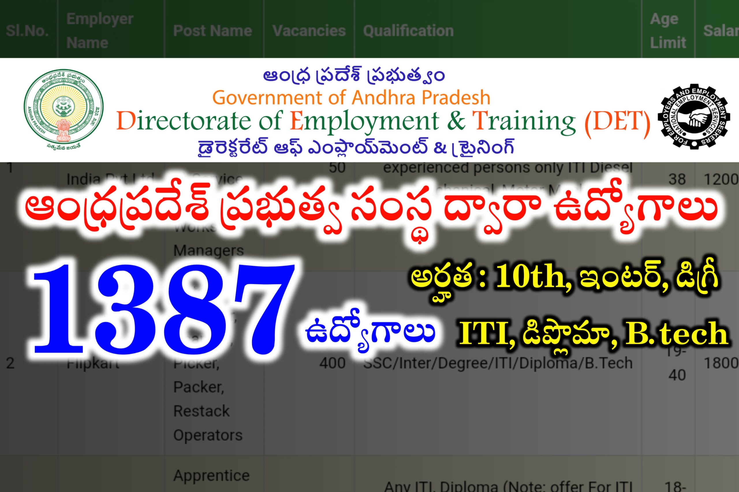 ఆంధ్రప్రదేశ్ ప్రభుత్వానికి చెందిన డైరెక్టరేట్ ఆఫ్ ఎంప్లాయిమెంట్ అండ్ ట్రైనింగ్ నుండి కొత్తగా మూడు నోటిఫికేషన్స్ విడుదల చేశారు. ఈ నోటిఫికేషన్స్ ద్వారా నిరుద్యోగ యువతకు వివిధ సంస్థల్లో ఉద్యోగ అవకాశాలు కల్పిస్తున్నారు. అర్హత గలవారు స్వయంగా ఇంటర్వ్యూకి హాజరయ్యి ఈ పోస్టులకు ఎంపిక కావచ్చు.