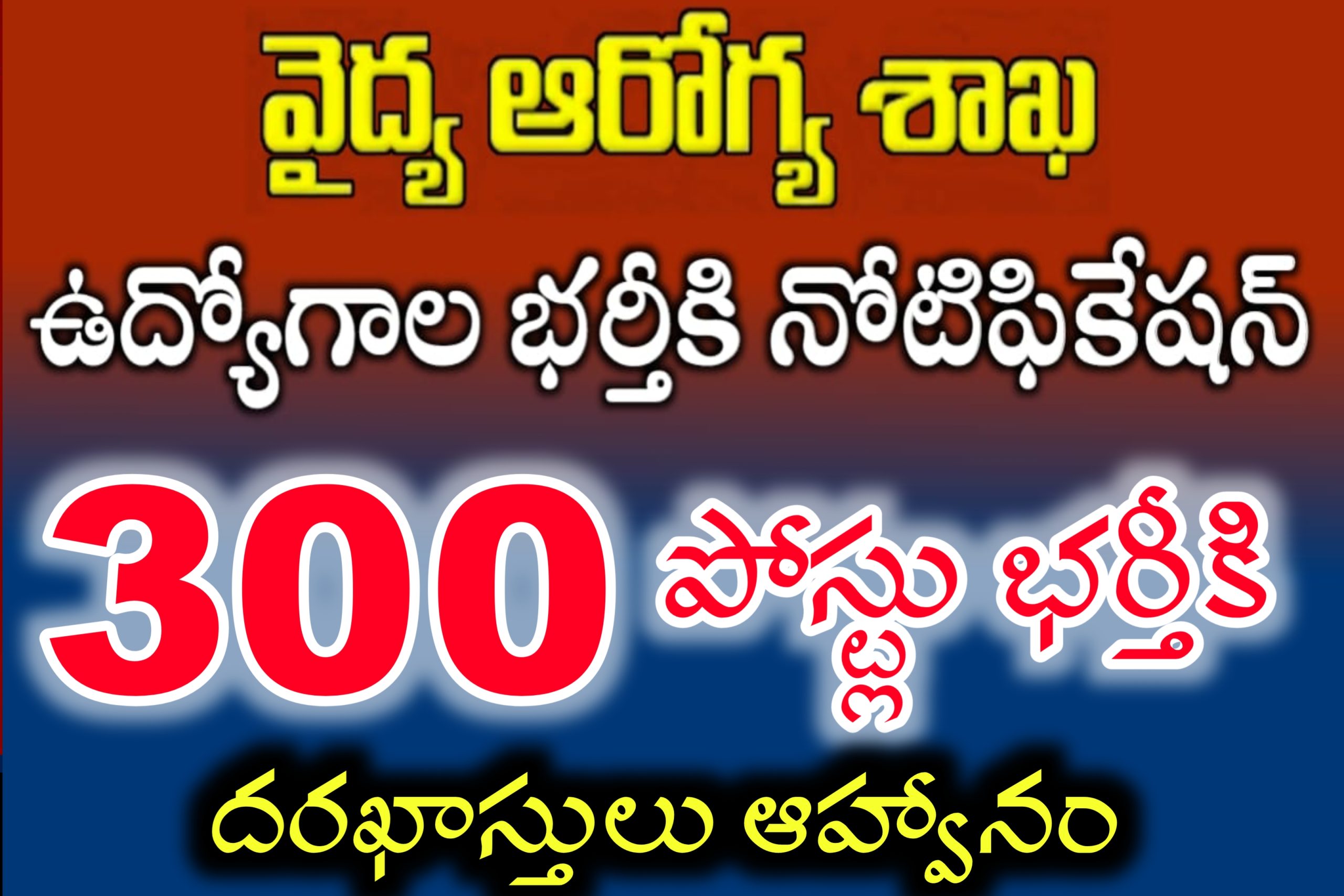 ఆంధ్రప్రదేశ్ రాష్ట్రంలో వైద్య ఆరోగ్య శాఖలో 300 ఉద్యోగాల భర్తీ కోసం నోటిఫికేషన్ విడుదల చేశారు ఈ నోటిఫికేషన్ ద్వారా రిక్రూట్మెంట్ చేస్తున్న ఉద్యోగాలకు అర్హులైన అభ్యర్థులు ఇంటర్వ్యూకు హాజరు కావాలి .