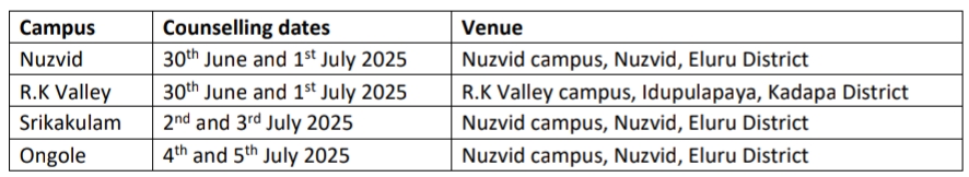 AP RGUKT IIIT అడ్మిషన్స్ కు ఎంపికైన వారికి జూన్ 30వ తేదీ నుండి జూలై 5వ తేదీ వరకు కౌన్సిలింగ్ నిర్వహిస్తామని అధికారులు తెలిపారు..