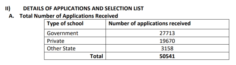 ఎంపికైన వారిలో 94.78% మంది విద్యార్థులు ప్రభుత్వ స్కూల్స్ నుండి 5.22% మంది విద్యార్థులు ప్రైవేట్ స్కూల్స్ నుండి ఎంపికయ్యారు. మొత్తం విద్యార్థుల్లో 69.01% మంది బాలికలు, 30.99% మంది బాలురు ఉన్నారు.
