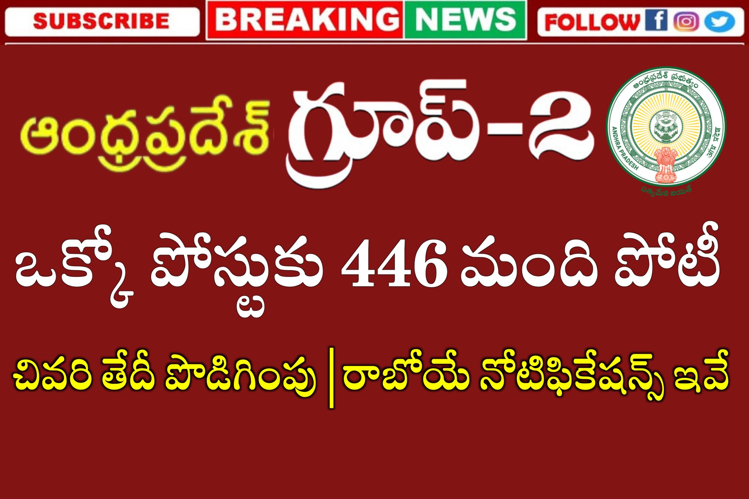 నోటిఫికేషన్ ప్రకారం ఈ ఉద్యోగాలకు జనవరి 10వ తేదితో చివరి తేదీ ముగిసింది. కొన్ని రకాల సాంకేతిక కారణాల వలన చాలా మంది నిరుద్యోగ అభ్యర్థులు ఈ పోస్టులకు అప్లై చేసుకోలేకపోయారు.. అభ్యర్థుల నుండి ఎక్కువ సంఖ్యలో వచ్చిన విజ్ఞప్తుల మేరకు APPSC గ్రూప్ – 2 ఉద్యోగాలకు అప్లికేషన్ చివరి తేదీ జనవరి 17 వరకు పొడిగించింది. ఈ మేరకు APPSC వెబ్ నోటీస్ విడుదల చేసింది. అలాగే నోటిఫికేషన్ లో ముందుగా తెలిపిన ప్రకారమే ఫిబ్రవరి 25వ తేదీన ప్రిలిమ్స్ ఖచ్చితంగా నిర్వహించబోతున్నట్లుగా ఆంధ్రప్రదేశ్ పబ్లిక్ సర్వీస్ కమిషన్ స్పష్టం చేసింది.