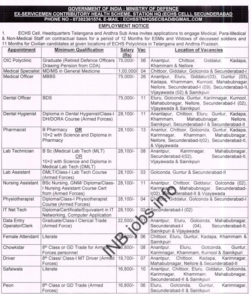 భారత ప్రభుత్వ రక్షణ మంత్రిత్వ శాఖకు చెందిన ఎక్స్ సర్వీస్మెన్ కాంట్రిబ్యూటరీ హెల్త్ స్కీమ్ , స్టేషన్ హెడ్ క్వార్టర్స్ (ఈసిహెచ్ఎస్ సెల్) సికింద్రాబాద్ నుండి వివిధ మెడికల్, పారామెడికల్ మరియు నాన్ మెడికల్ ఉద్యోగాలు భర్తీకి దరఖాస్తులు కోరుతూ నోటిఫికేషన్ విడుదలైంది. ఈ నోటిఫికేషన్ ద్వారా ఆంధ్రప్రదేశ్ మరియు తెలంగాణ లో ఉన్న ESHS పాలీ క్లినిక్స్ లో ఉన్న ఖాళీలను భర్తీ చేస్తున్నారు..