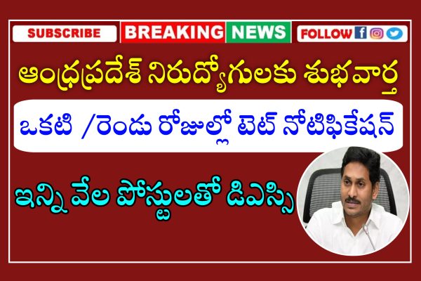 ఆంధ్రప్రదేశ్ రాష్ట్రంలో టీచర్ పోస్టుల నోటిఫికేషన్ కోసం ఎదురుచూస్తున్న నిరుద్యోగులకు శుభవార్త. డిఈడి, బిఈడి పూర్తి చేసిన వారి కోసం త్వరలో డీఎస్సీ నోటిఫికేషన్ విడుదల చేసేందుకు ఏర్పాటు చేస్తున్న ప్రభుత్వం మరోపక్క టెట్ నోటిఫికేషన్ విడుదల చేయడానికి సిద్ధమవుతుంది. ఈ మేరకు పాఠశాల విద్యాశాఖ మార్గదర్శకాలు కూడా జారీ చేసింది.   ✅ పేద నిరుద్యోగులకు అతి తక్కువ ధరలో గ్రామ సచివాలయం , పోలీసు ఉద్యోగాలు , గ్రూప్-2 , బ్యాంక్, RRB, SSC…