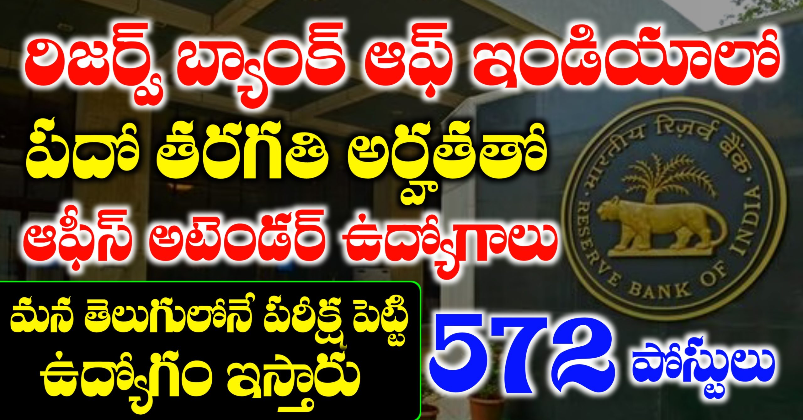 RBI 572 Office Attendant Recruitment 2026 : రిజర్వ్ బ్యాంక్ ఆఫ్ ఇండియా నుండి ఆఫీస్ అటెండెంట్ అనే ఉద్యోగాలను భర్తీ చేసేందుకు బంపర్ రిక్రూట్మెంట్ నోటిఫికేషన్ విడుదలైంది. ఈ నోటిఫికేషన్ ద్వారా 572 ఉద్యోగాలు భర్తీ చేస్తున్నారు. కేవలం టెన్త్ క్లాస్ అర్హతతో ఈ ఉద్యోగాలు భర్తీ చేస్తుండడంతో నిరుద్యోగులకు ఒక మంచి అవకాశం గా చెప్పవచ్చు. ఎంపికైన వారు మన తెలుగు రాష్ట్రంలోనే పనిచేసే అవకాశాన్ని కూడా పొందవచ్చు. తెలుగు రాష్ట్రాల్లో ఉద్యోగాలకు అప్లై చేయాలి అనుకునే అభ్యర్థులకు పదో తరగతి అర్హతతో పాటు తెలుగు భాష కూడా వచ్చి ఉండాలి.
