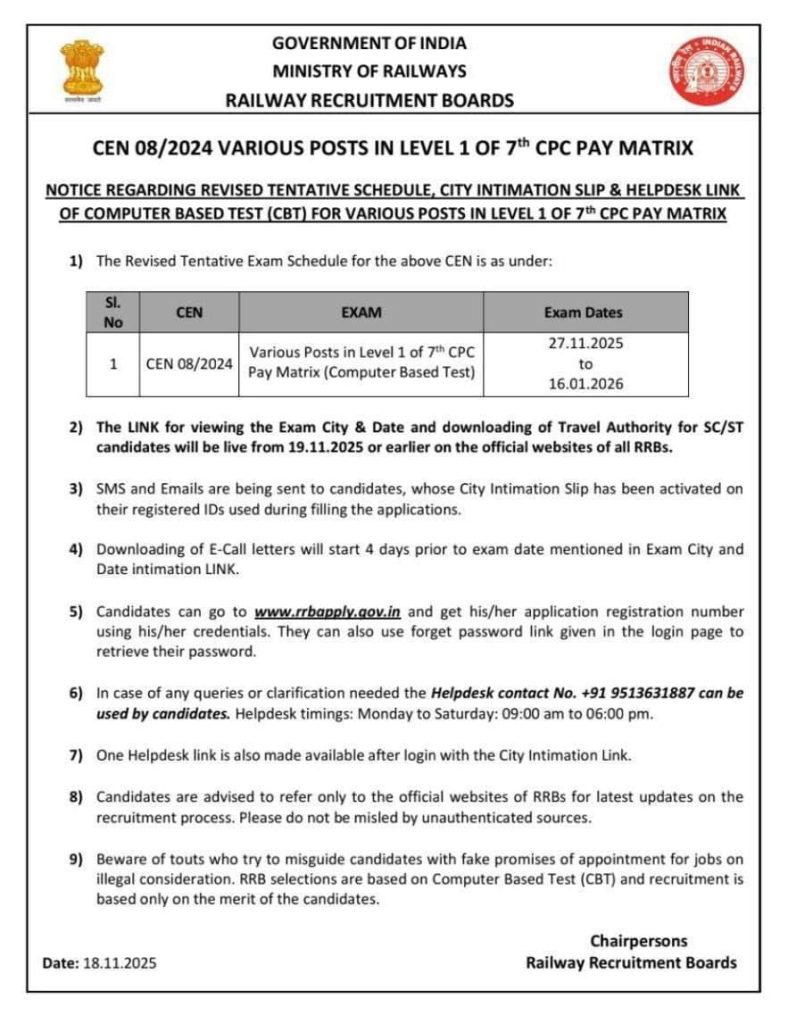 RRB Group D New Exam Dates 2025 : రైల్వే రిక్రూట్మెంట్ బోర్డ్ (RRB) గ్రూప్-డీ కంప్యూటర్ ఆధారిత పరీక్షలు కోసం కొత్తగా షెడ్యూల్ విడుదలైంది. సవరించిన షెడ్యూల్ ప్రకారం.. ఈ పరీక్షలను 2025 నవంబర్ 27 నుంచి 2026 జనవరి 16 వరకు నిర్వహించనున్నారు. ముందుగా ప్రకటించిన షెడ్యూల్ ప్రకారం ఈ పరీక్షలు ఈ నెల 17 నుంచి ప్రారంభం కావాల్సి ఉంది. అయితే నియామక ప్రక్రియకు సంబంధించిన కోర్టు కేసు కారణంగా పరీక్షలు వాయిదా పడ్డాయి. గత వారం కోర్టు ఉత్తర్వులు జారీచేసిన తర్వాత తాజాగా నూతన తేదీలను ఖరారు చేశారు.